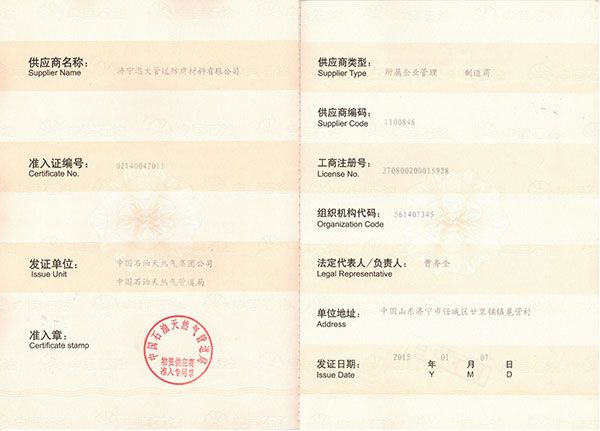 中國石油天然氣集團(tuán)公司物資供應(yīng)商準(zhǔn)入證